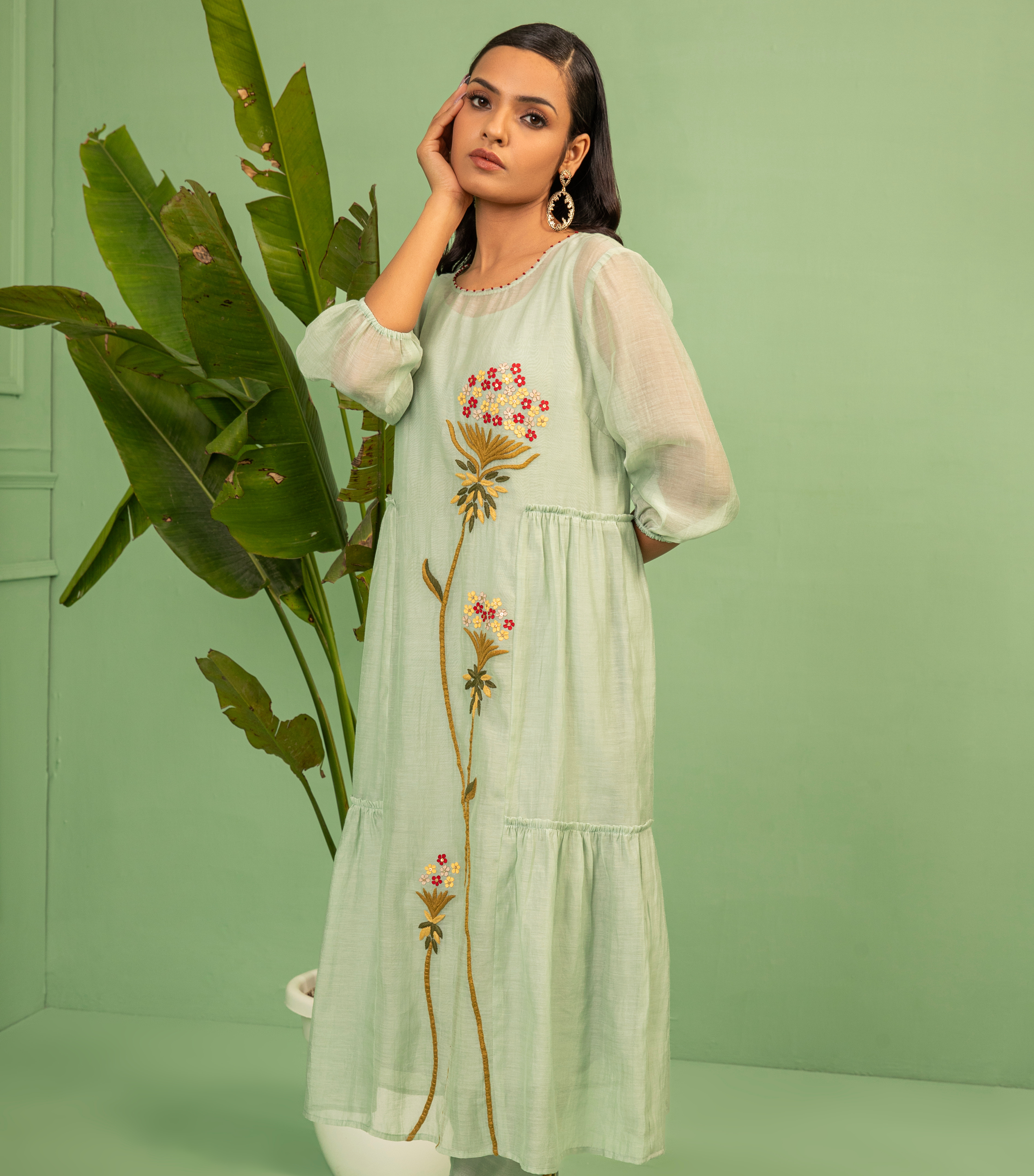 Description: This happy floral aqua chanderi poster tier dress with gathers and detailed with floral hand work, accompanied with straight tulip pants, makes this the perfect outfit for a luncheon or evening party this season.