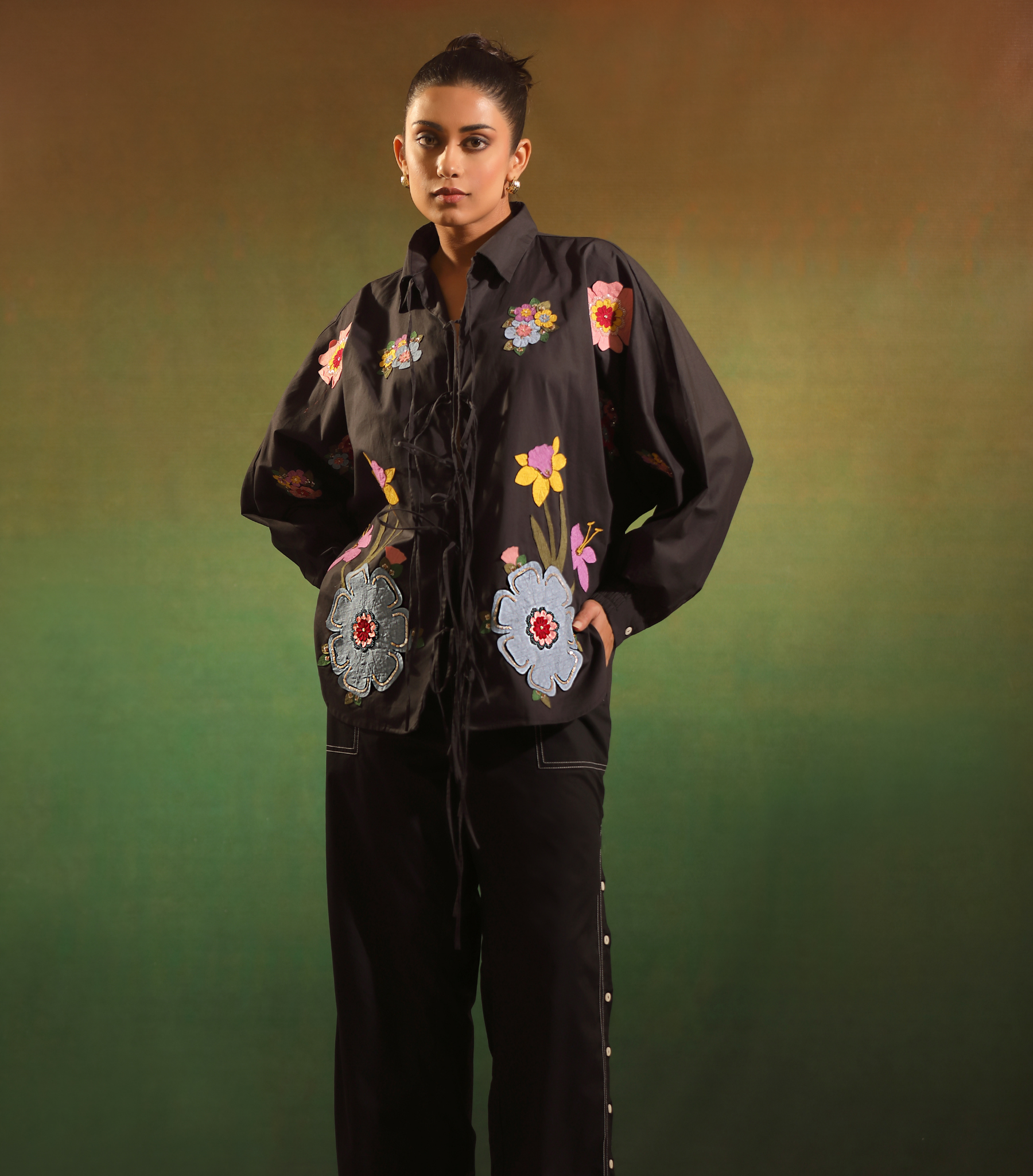 Description: A bold black co-ord set brought to life with intricate badabagh-inspired laser-cut appliqué in vibrant floral motifs. The dolman sleeve shirt features a relaxed silhouette with a statement string placket, paired with straight trousers finished with button detailing along the sides. Perfect for festive gatherings, cultural occasions, or elevated casual evenings, this ensemble blends contemporary structure with timeless floral artistry.