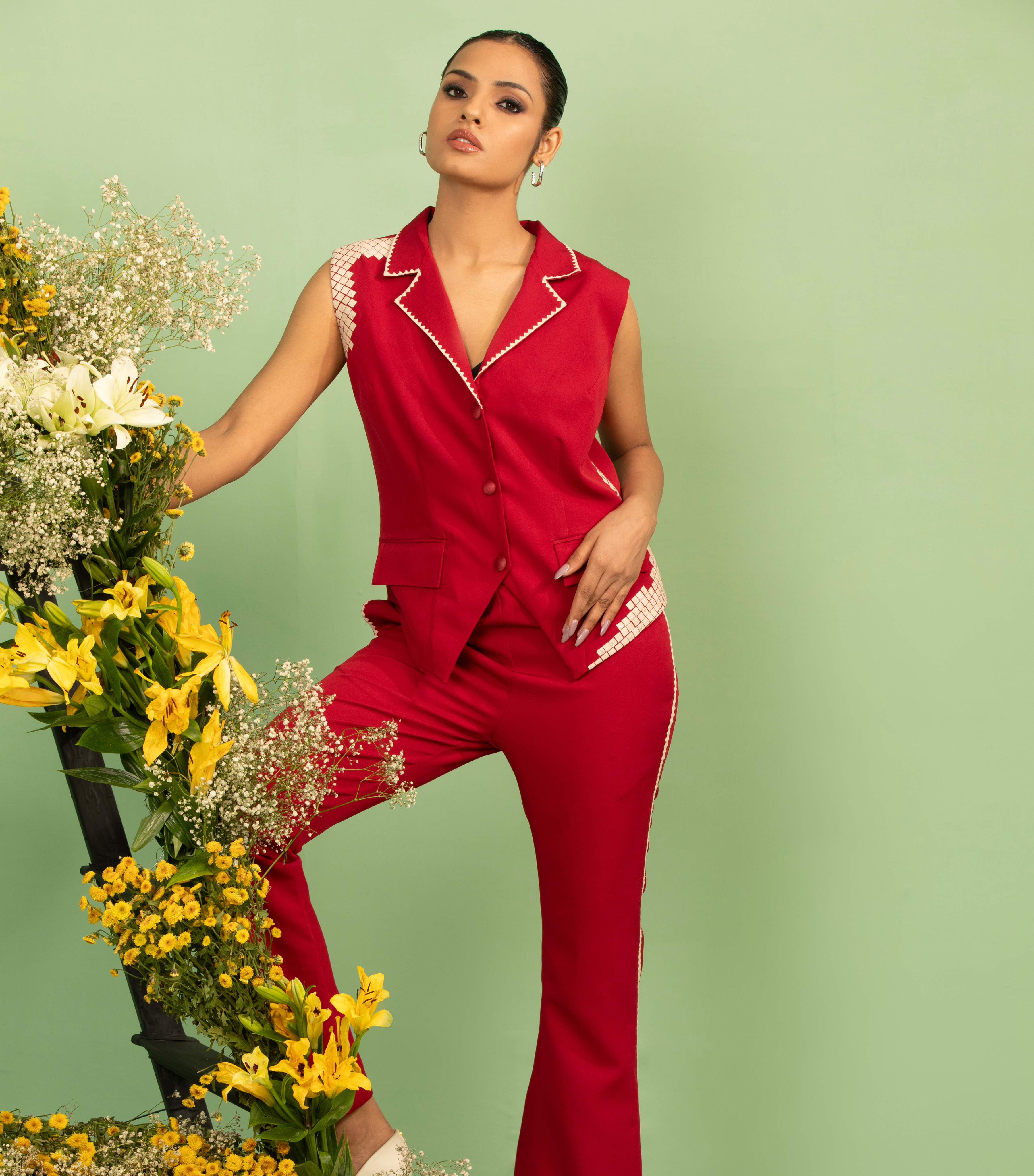 Description: This quintessential red waist coat with boot-cut pants in banana crepe fabric with geometric appliqué embroidery finished with lace is the perfect attire for a lunch, a formal meeting or an evening party!