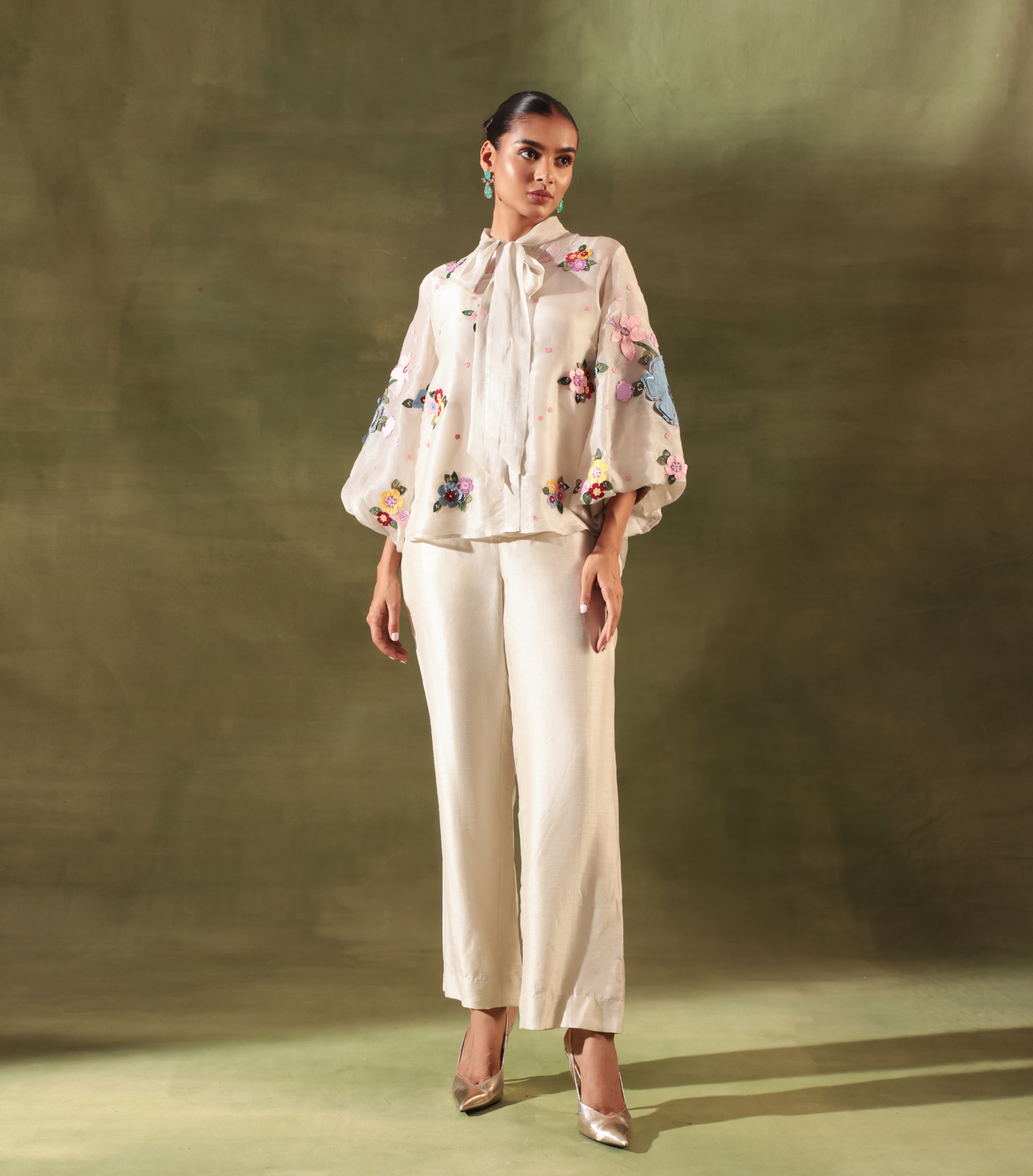 Description: Elegant and luxurious, this beige co-ord set in sheer organza features a front tie-up top paired with sleek straight-fit trousers. Embellished with delicate Badabagh floral embroidery across the sleeves and bodice, this ensemble blends minimalism with heritage craft. Perfect for day-time festivities or elegant luncheons.