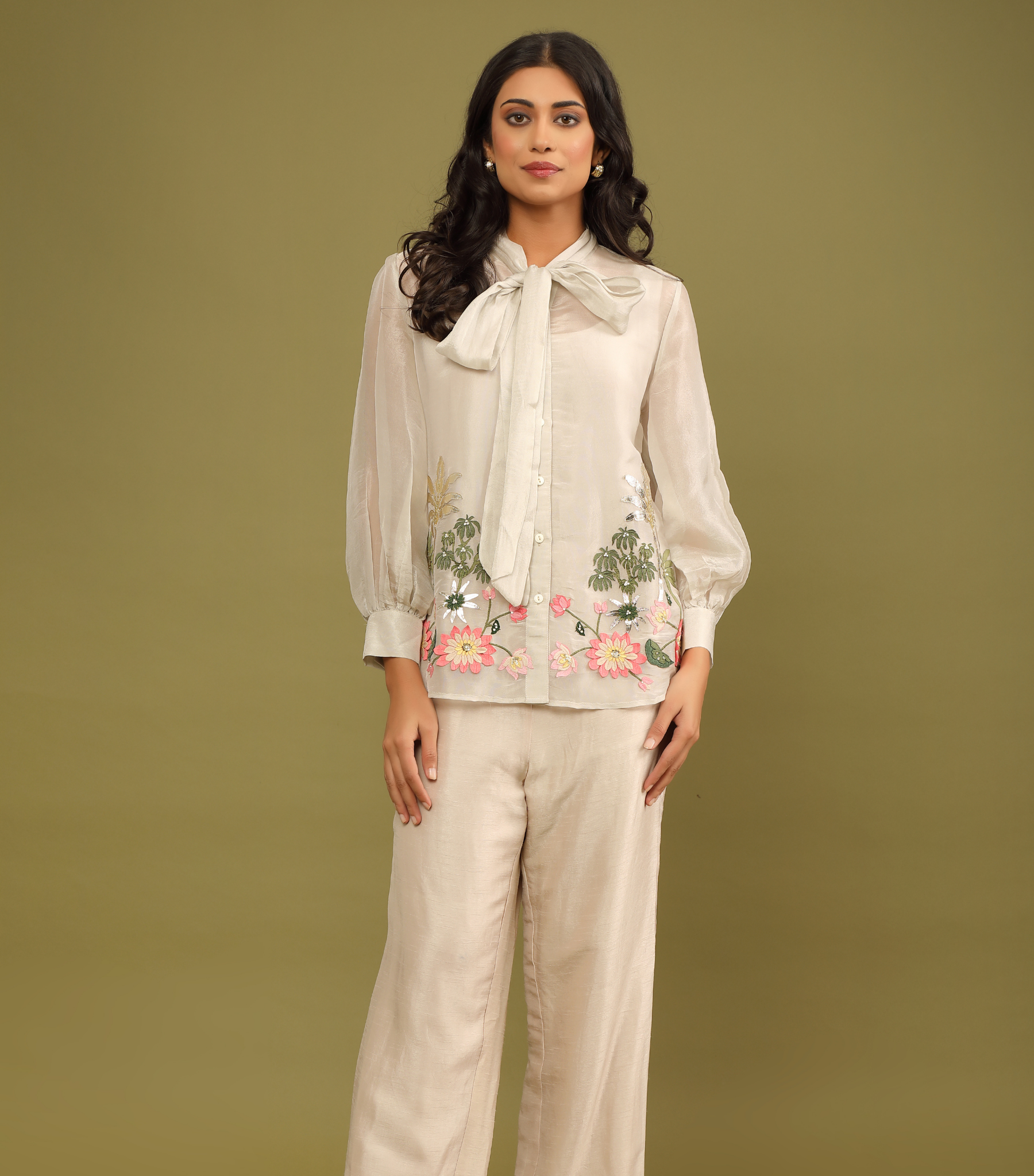 Description: Elegant and luxurious, this beige co-ord set in sheer organza features a front tie-up top paired with sleek straight-fit trousers. Embellished with delicate pichwai embroidery across the bodice, this ensemble blends minimalism with heritage craft. Perfect for day-time festivities or elegant luncheons.