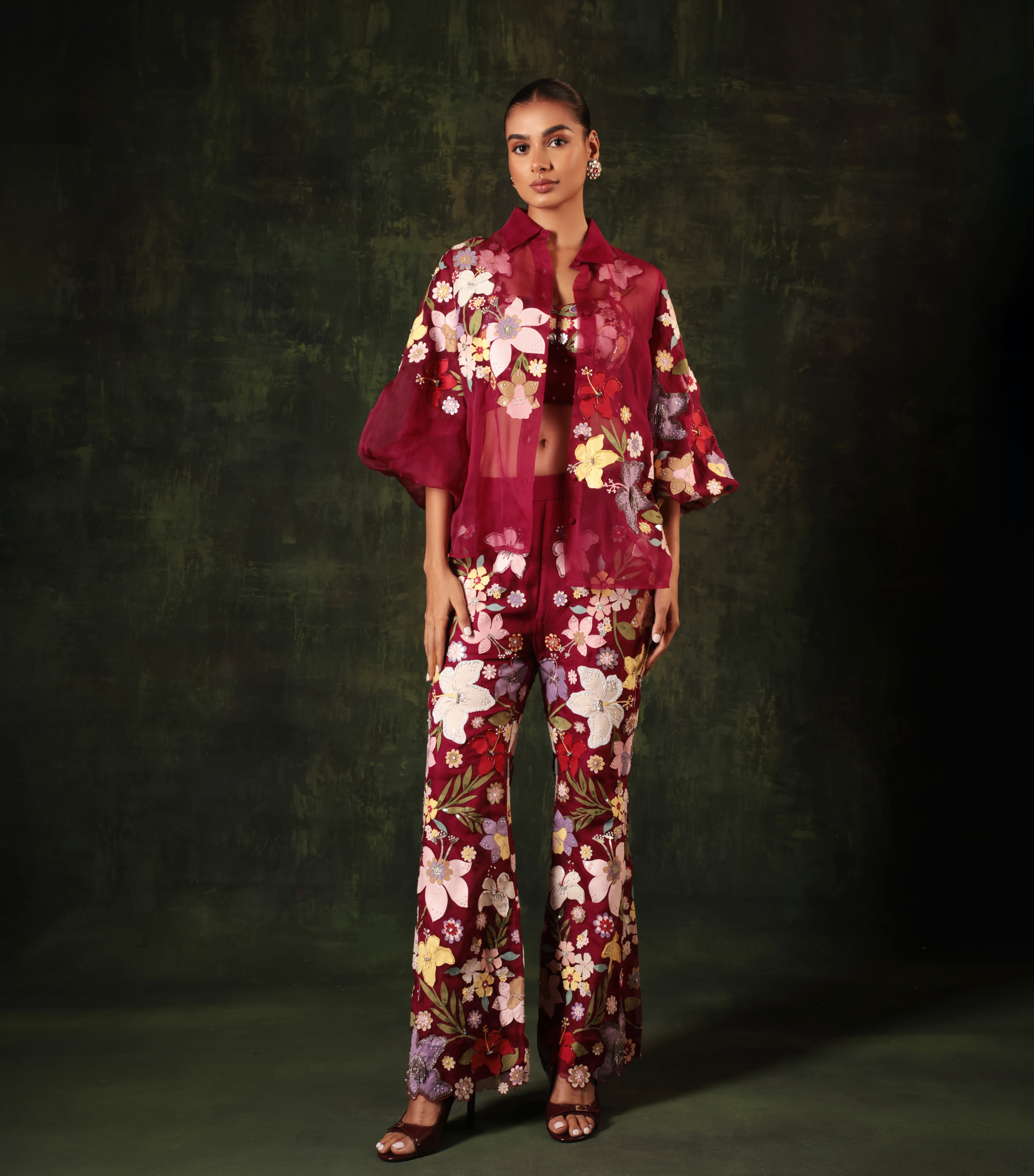 Description: The enchanting co-ord set is a celebration of elegance and artistry — featuring a sheer organza shirt adorned with delicate floral botanical embroidery, paired with beautifully embellished wide-leg pants. A statement ensemble designed to captivate at every glance.