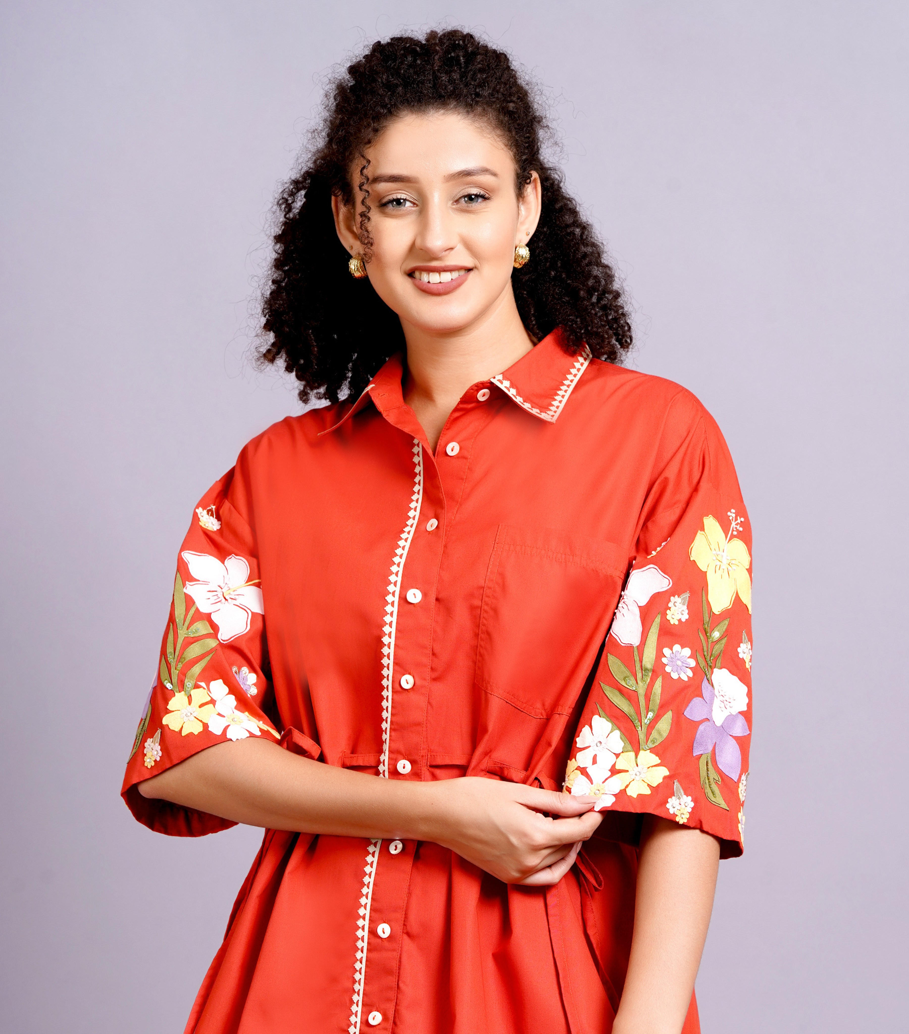 Description: Botanical floral embroidery on the sleeves detailed with lace is a must to have attire in your wardrobe. This drawstring co-ord set shirt ties beautifuly at the waist giving the outfit a touch of elegance, this set is sure to turn heads this season!