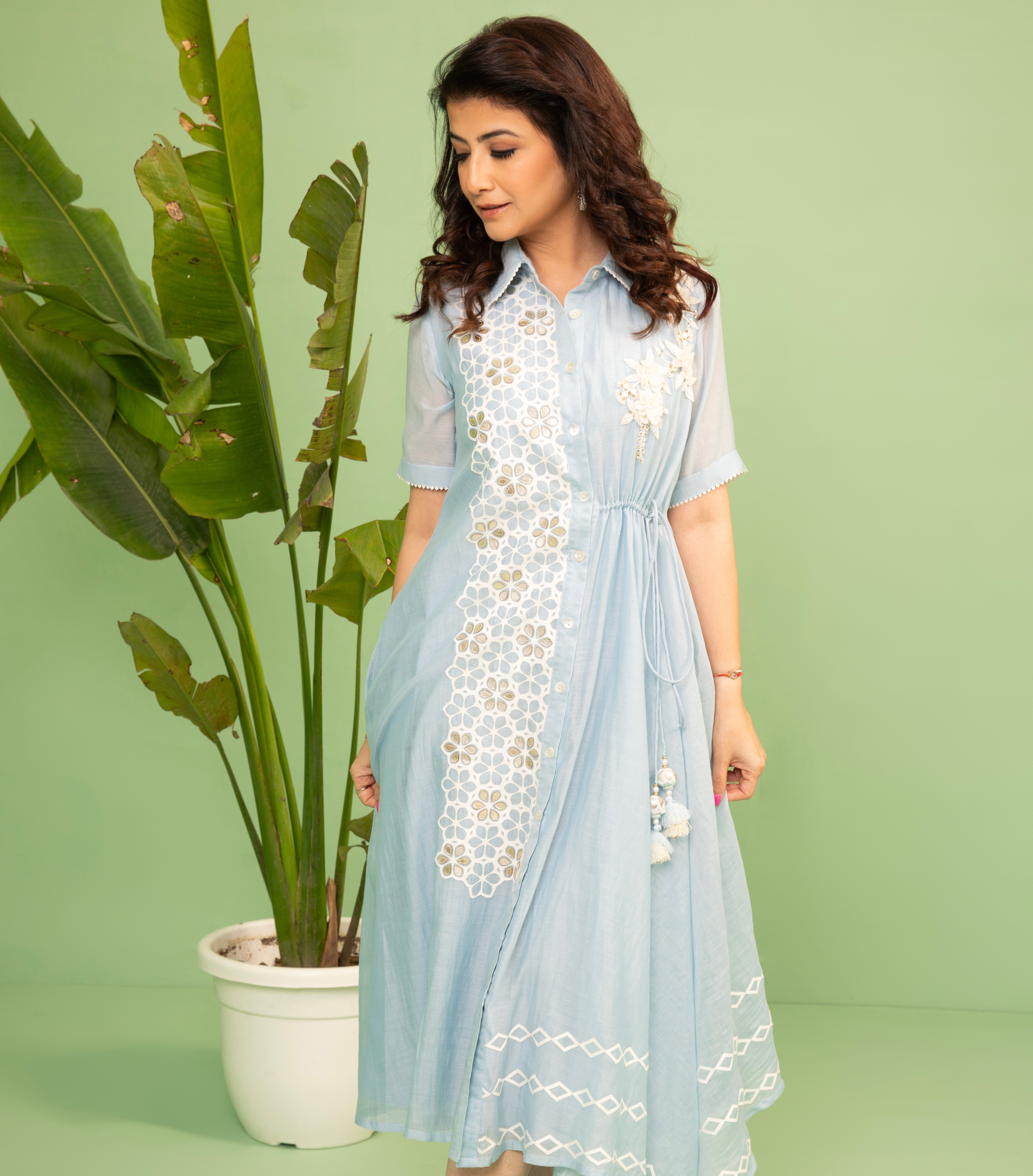 Description: Asymmetrical, one side tie up chanderi dress with white suede and gold jaali embroidery with felt flowers, adorned with a fancy tie up. Ideal for summer days and evenings.