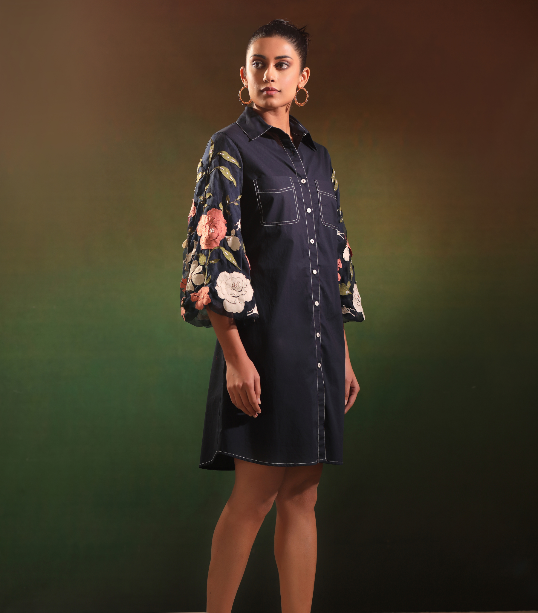Description: Striking and bold, this shirt-style navy dress is a fusion of structure and softness. Featuring solid cotton with contrasting floral gulab embroidery and sheer organza balloon sleeves, this above-knee dress makes a confident statement. Buttoned through the front with patch pockets, it’s ideal for festive dinners or fashion-forward occasions.