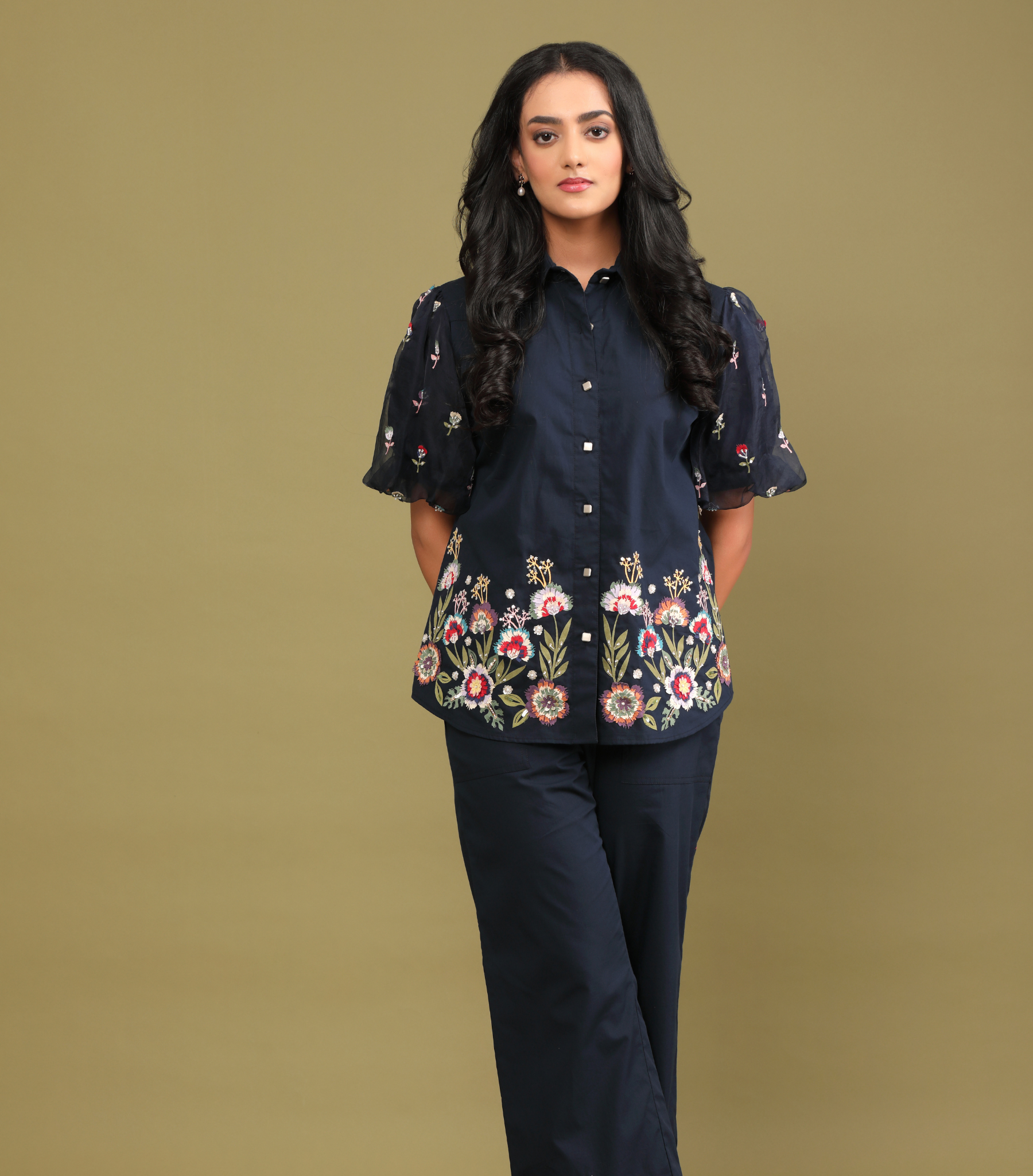 Description: Soft and sophisticated, this navy coord set is rendered in a classic silhouette with our signature phoolwari embroidery. The cotton shirt features short balloon sleeves in organza and a structured shirt collar for a refined finish. The matching pants mirror the floral detailing, making this ensemble perfect for brunches, day celebrations, or effortless festive dressing.