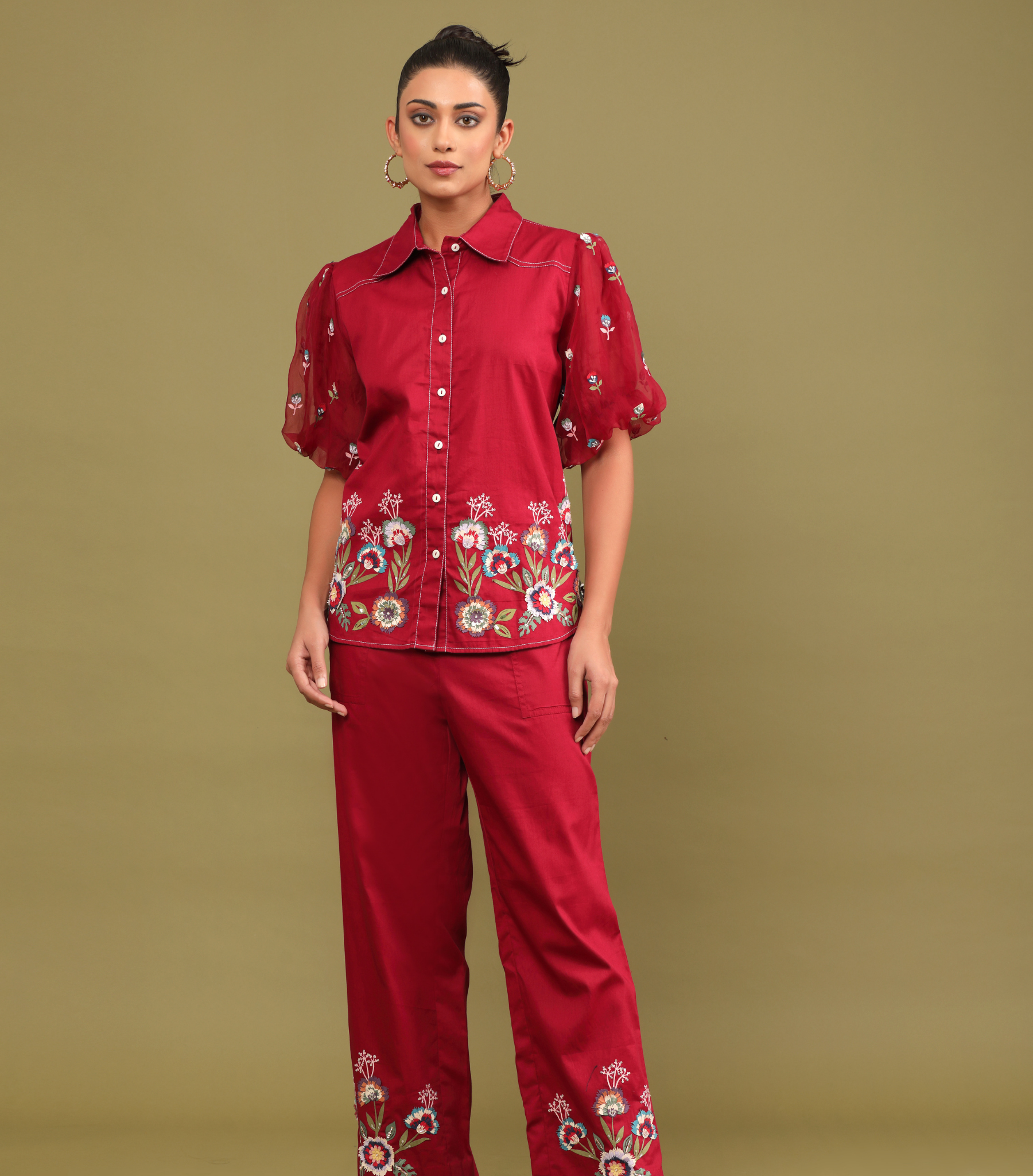 Description: Soft and sophisticated, this red coord set is rendered in a classic silhouette with our signature phoolwari embroidery. The cotton shirt features short balloon sleeves in organza and a structured shirt collar for a refined finish. The matching pants mirror the floral detailing, making this ensemble perfect for brunches, day celebrations, or effortless festive dressing.