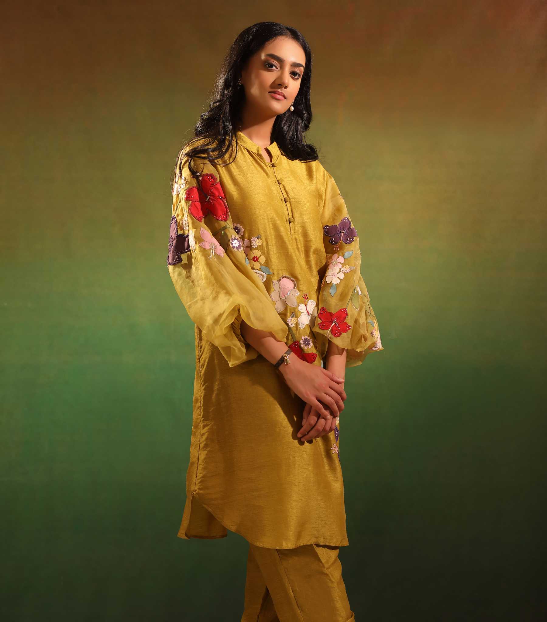 Description: A bold and vibrant expression of handcrafted beauty, this pista green kurta set in bamber silk is adorned with delicate botanical floral embroidery in a mix of pastel and bright tones. The kurta features voluminous balloon sleeves, a soft mandarin neckline and a fluid high-low hem. Paired with straight pants finished with matching floral appliqué , this set brings playful elegance to day festivities and intimate gatherings.