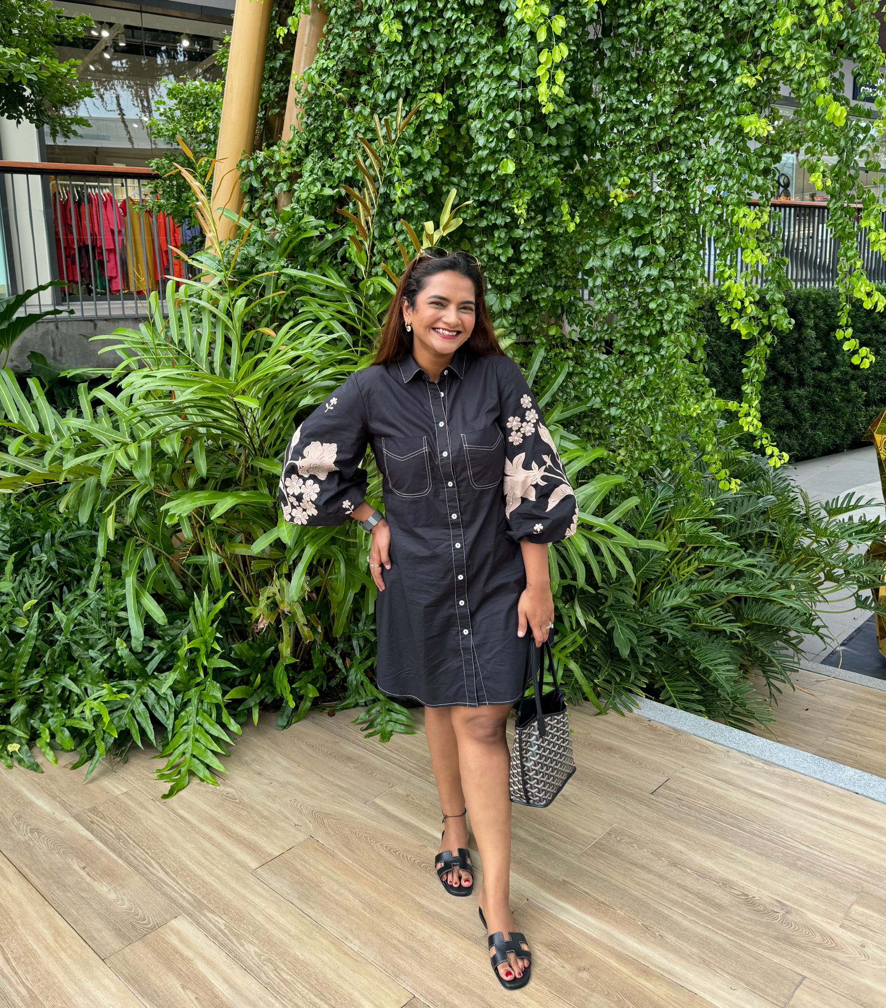 Description: Straight shirt style dress with balloon sleeves. Detailed with front pockets and stitch lines. Dull white hibiscus laser cut appliqué embroidery is the highlight of this dress. Perfect for day and evening parties.