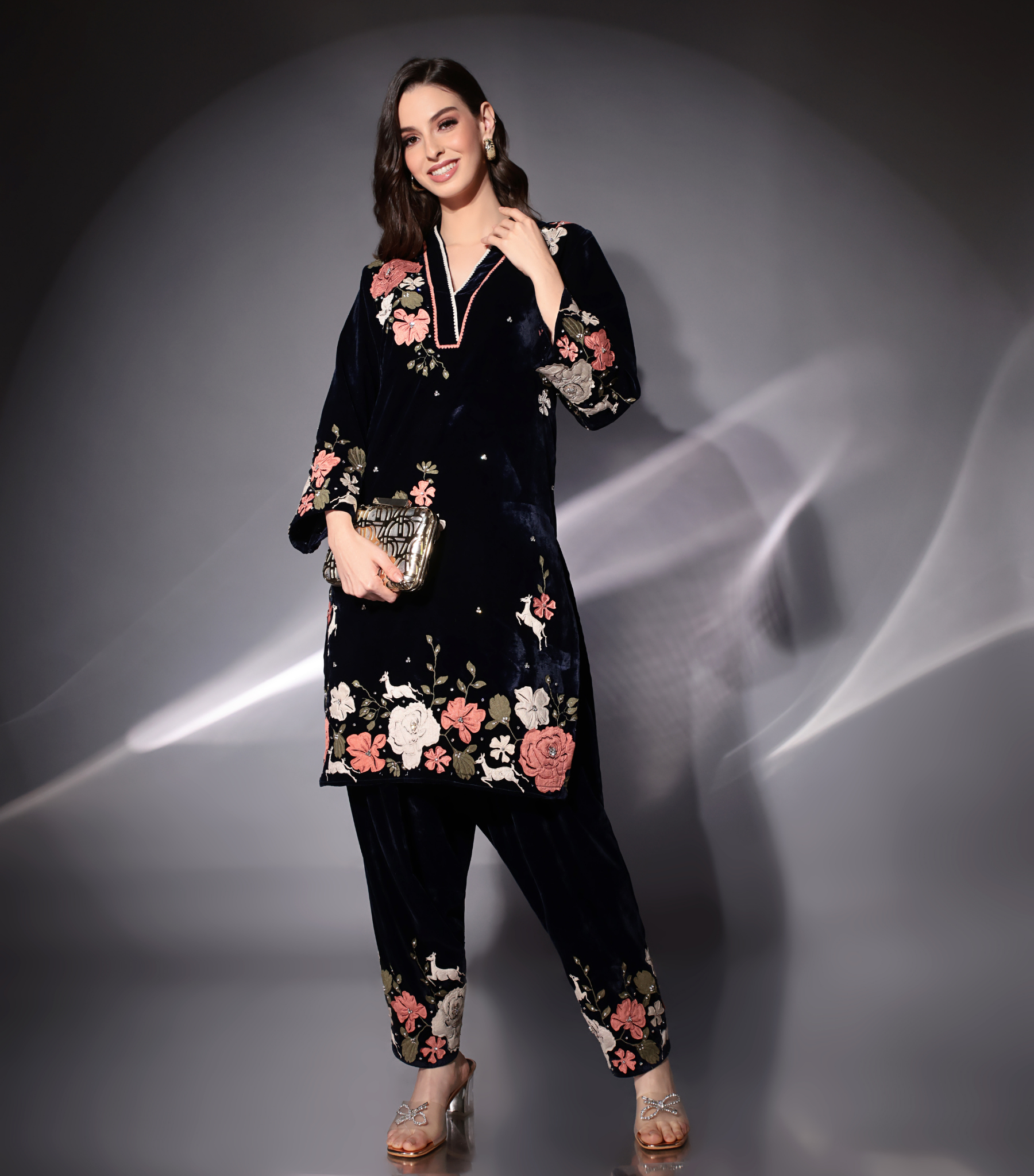 Description: Crafted from sumptuously soft Navy Velvet, this ensemble drapes with an inherent richness, its deep, enigmatic hue evoking the magic of a winter night sky. Across this luxurious canvas, the exquisite Gulab Embroidery unfurls. Lush, detailed rose motifs in shades of delicate pinks, creams, and earthy greens blossom with unparalleled vibrancy, each petal brought to life with intricate laser cut applique work. Adding a touch of celestial glamour, subtle rhinestone embellishments twinkle amongst the roses, catching the light with a soft, ethereal glow. Paired with this is the coordinating Trouser, a modern take on a classic, offering a relaxed yet tapered fit (likely a salwar or tulip-style pant) also adorned with the stunning Gulab embroidery around the cuffs.