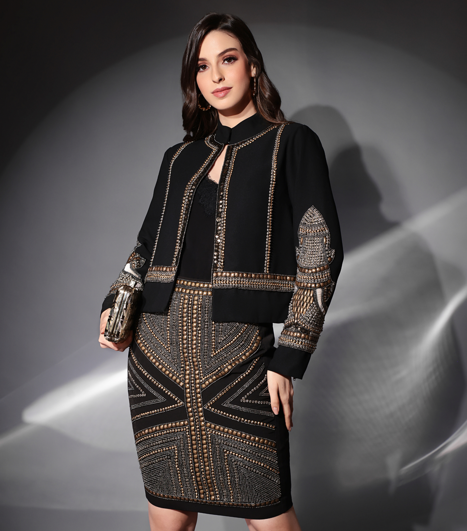 Description: Immersed in the timeless elegance of deep black crepe, the fabric becomes a dramatic, sleek canvas for a mesmerizing display of texture. The piece is crowned with heavy, intricate metallic handwork embroidery in dazzling gold and gunmetal tones, forming sharp, geometric patterns that recall Art Deco majesty. The coordinating Pencil Skirt offers a sleek, contouring fit, entirely blanketed in the scintillating beadwork. This full-surface embellishment ensures a luxurious weight and movement, sculpting the figure in a column of reflective artistry. Ideal for sophisticated cocktail parties, New Year’s Eve galas, and high-fashion winter events, this ensemble blends the austerity of black with the joyous sparkle of couture embellishment, promising an entrance that is both bold and utterly unforgettable.
