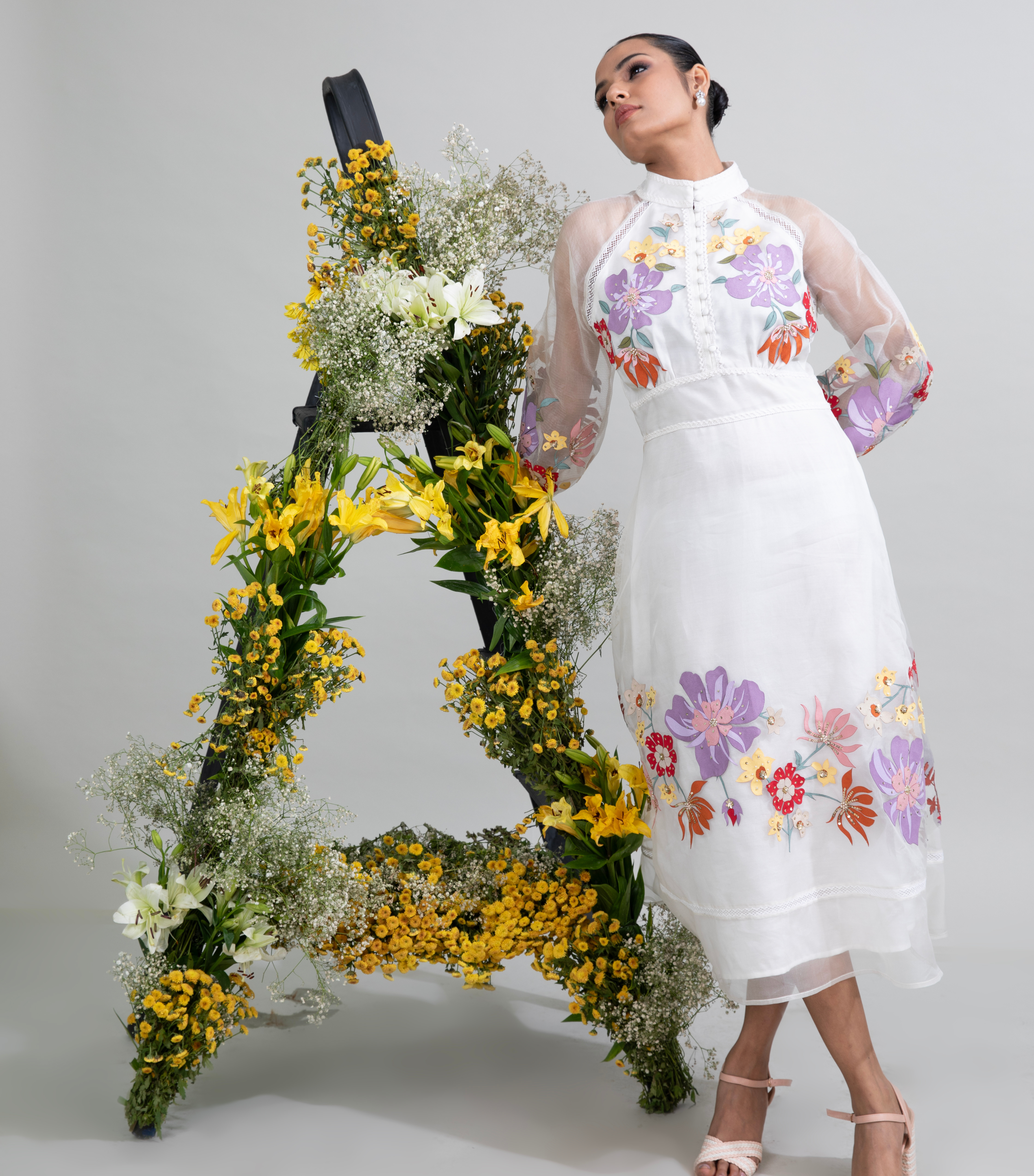 Description: Fit & flair organza dress with heavy big flower floral appliqué embroidery all over. Finished with beautiful lace trimmings & buttons. A high fashion stylish silhouette ideal for a summer brunch or an sundowner.
