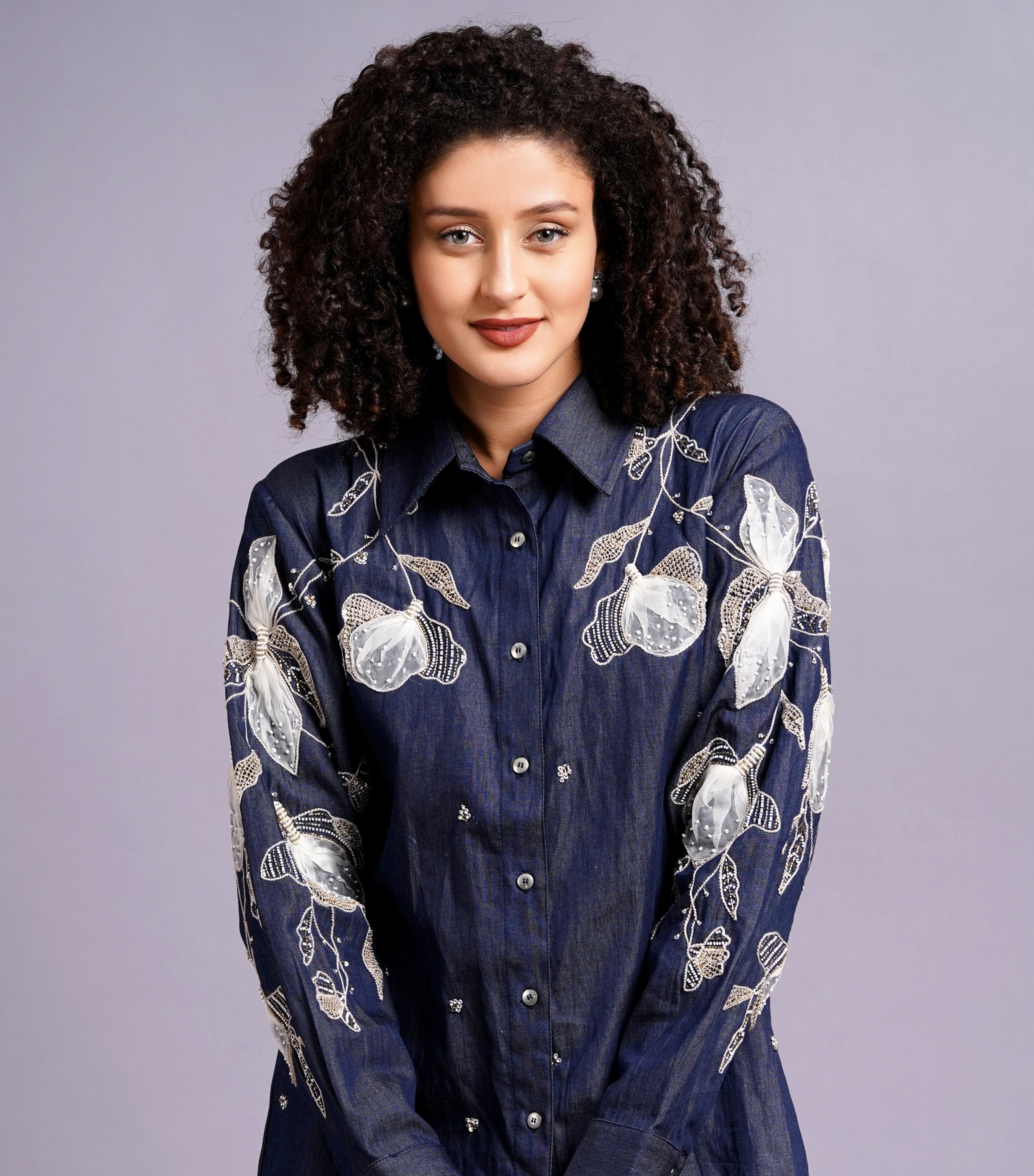 Description: An exquisite white organza appliqué hand embroidered zari work full sleeves denim co-ord set. Be it a fancy brunch to a sundowner, this is the co-ord set to be worn!